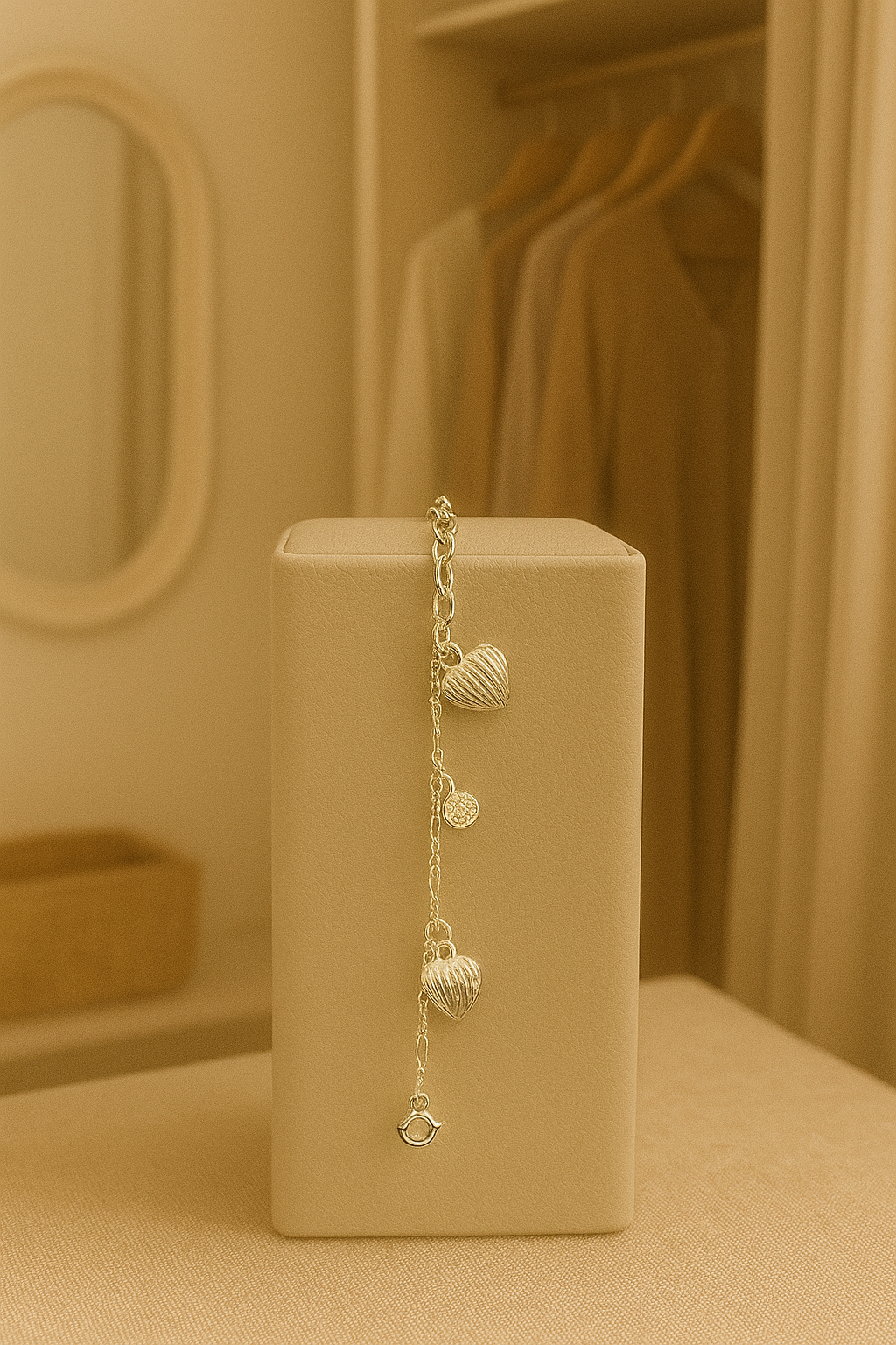 π Chic Heart Charm Design β Stylish silver toned bracelet featuring delicate heart and round charms for a trendy, elegant look.